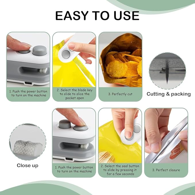 ✔ Multi-purpose sealing (image labels) – Works perfectly on chip bags, cookie packs, salad bags, and vacuum food storage, helping reduce food waste.